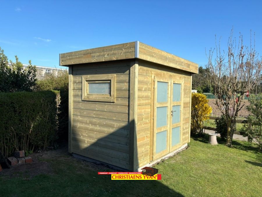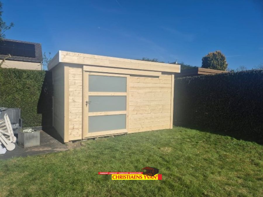 This contemporary log cabin guarantees many years of garden joy. It has a solid log construction and completely matches a modern garden. The large windows in the double sliding door let in a great amount of light. Treat with outdoor oil or colour stain.