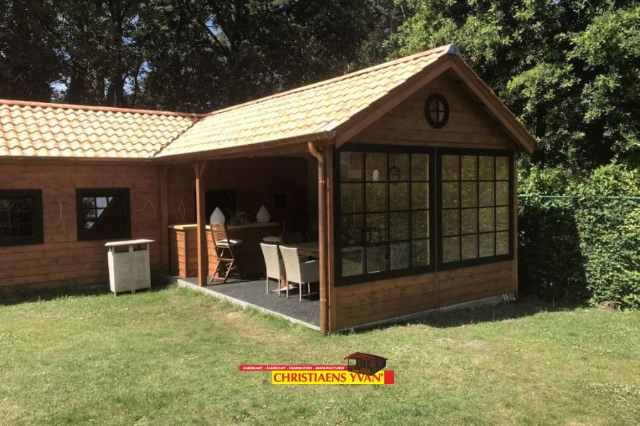 Un cottage majestueux en chêne, doté d’une large terrasse et d’un style champêtre qui font rêver. L’endroit idéal pour profiter plus longtemps de vos journées ou pour bavarder avec vos invités au bar. La double porte facilite le passage d’objets volumineux. L’auvent en bois apporte une belle finition. Le bois de chêne ne nécessite aucun traitement ultérieur. Il vaut mieux faire appel à notre service de montage pour installer le cottage.